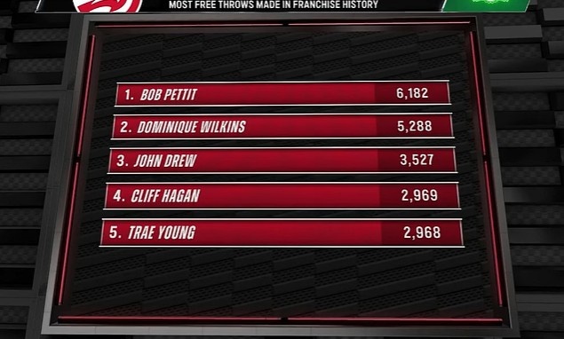 第二節(jié),老鷹球星特雷-楊造成殺傷兩罰全中,罰球命中數(shù)也來到2970,升至隊史第四。