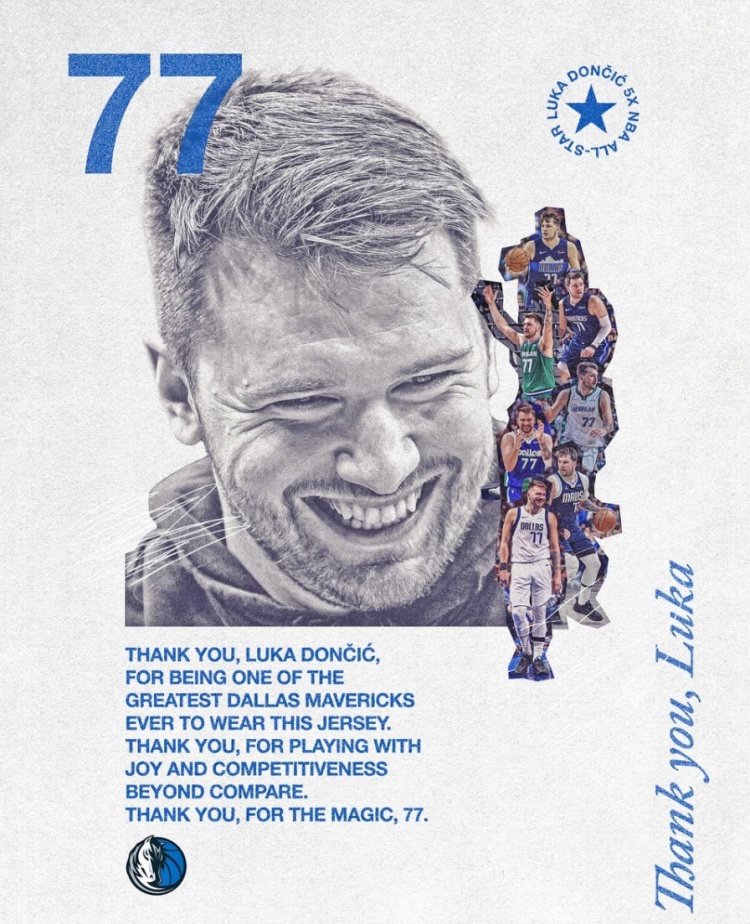 在海報(bào)上官方寫道:“謝謝你,盧卡-東契奇。你是達(dá)拉斯獨(dú)行俠隊(duì)史最偉大的球員之一。謝謝你帶著快樂和無與倫比的競(jìng)爭(zhēng)力打球。謝謝你,盧卡魔法,77。”