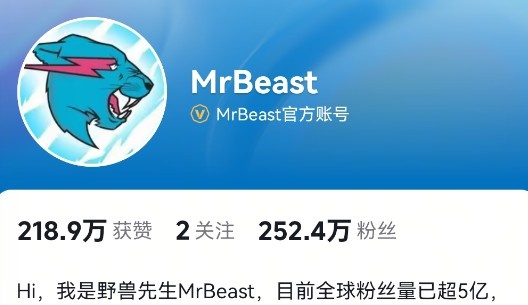 MrBeast原名James Steven “Jimmy” Donaldson,美國Youtube視頻博主。其作為核心成員的MrBeast團隊頻道在Youtube上擁有3.55億粉絲;他在B站有402萬粉絲,在抖音有252萬粉絲,目前全球粉絲量超5億。