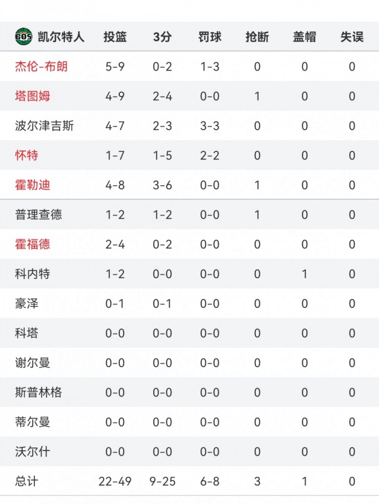 上半場(chǎng),凱爾特人穩(wěn)扎穩(wěn)打,全隊(duì)沒(méi)有出現(xiàn)失誤,4人得分上雙,波爾津吉斯13分最高,杰倫-布朗和朱-霍勒迪各拿11分,塔圖姆10分入賬。