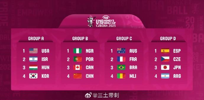 2月4日訊 2025年U19女籃世界杯分組抽簽結(jié)束,中國(guó)女籃分到了B組,同組的有尼日利亞、葡萄牙、加拿大。具體分組如下: