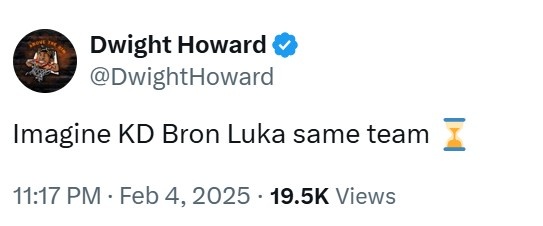 2月4日訊 今天,前NBA球員德懷特-霍華德更推道:“想象一下杜蘭特、勒布朗和東契奇在一支球隊(duì)???!?/p>