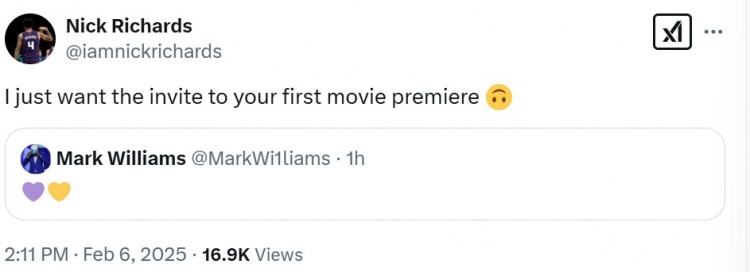2月6日訊 據(jù)名記Shams報(bào)道,湖人和黃蜂達(dá)成交易,得到23歲的年輕中鋒馬克-威廉姆斯!馬威第一時(shí)間更新社媒:“?????????!?/p>前隊(duì)友尼克-理查茲評(píng)論道:“我只想要你在湖人首秀的邀請(qǐng)?!?/p> 本文標(biāo)簽: NBA 籃球 湖人 太陽(yáng)