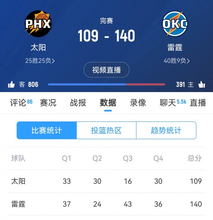 2月6日訊 NBA常規(guī)賽,太陽109-140大比分不敵雷霆。