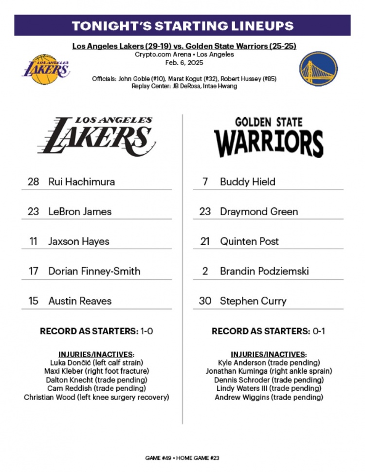 2月7日訊 今天中午11點(diǎn),湖人將主場(chǎng)對(duì)陣勇士。賽前,雙方公布了首發(fā)陣容。湖人:八村塁、詹姆斯、海斯、芬尼、里夫斯。勇士:希爾德、追夢(mèng)、波斯特、波杰姆斯基、庫(kù)里。 本文標(biāo)簽: NBA 籃球 勇士 湖人 詹姆斯 庫(kù)里 追夢(mèng)