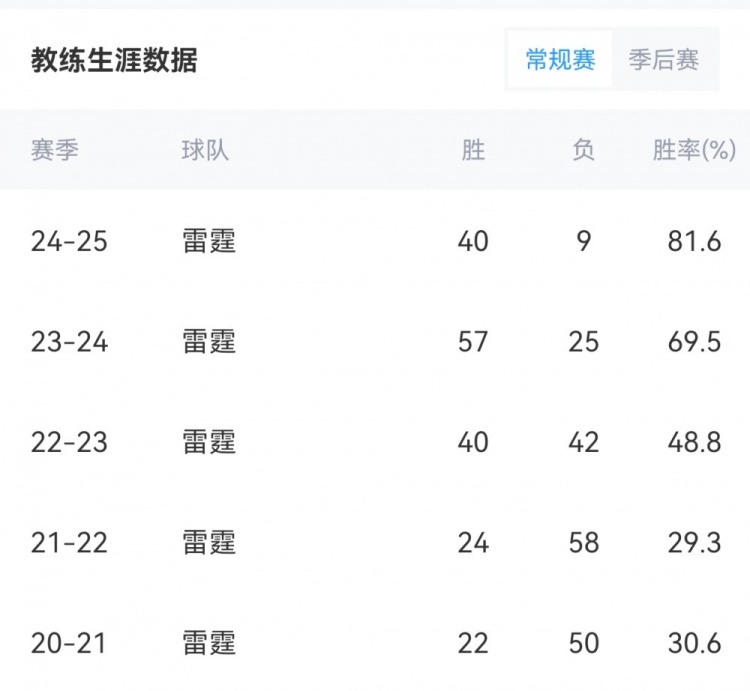 2月8日訊 今日NBA常規(guī)賽,雷霆121-109戰(zhàn)勝猛龍。至此,主帥戴格諾特執(zhí)教生涯(20-21賽季至今)戰(zhàn)績(jī)來到了184勝184負(fù),勝率達(dá)到50%。戴格諾特生涯每個(gè)賽季執(zhí)教戰(zhàn)績(jī)和勝率如下:相關(guān)新聞>>>頭兩季僅30%勝率!雷霆主帥戴格諾特執(zhí)教勝率來到50% 本文標(biāo)簽: 籃球 NBA 雷霆