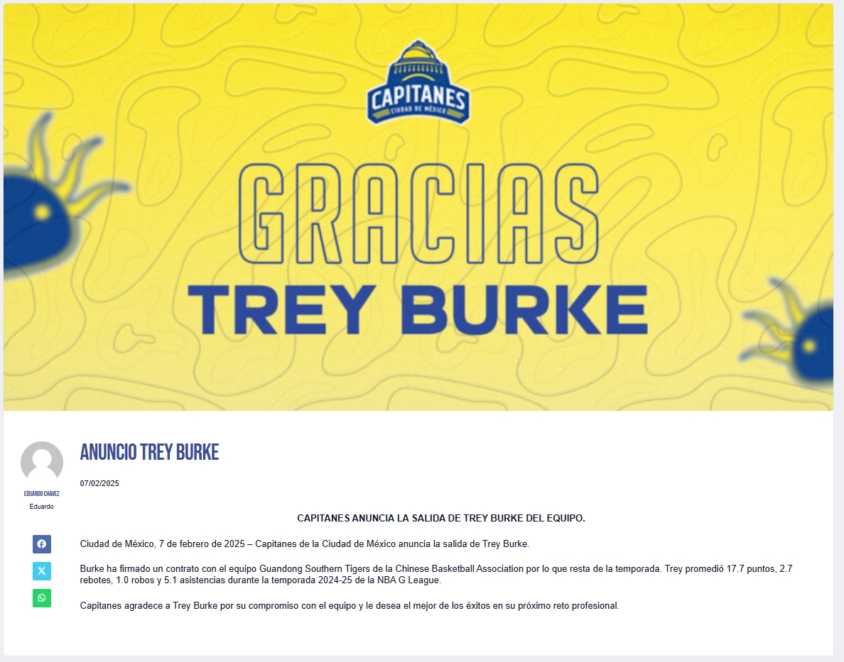 02月09日訊 G聯(lián)盟墨西哥城隊(duì)長(zhǎng)官方宣布,特雷-伯克正式離隊(duì)并與CBA廣東宏遠(yuǎn)男籃簽約至賽季結(jié)束。