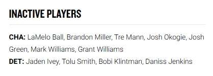 值得一提的是,黃蜂今天就有比賽,他們以102-112不敵活塞。馬威沒(méi)有被激活,缺席了本場(chǎng)比賽。
