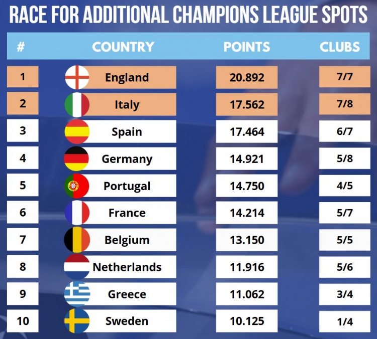 注:根據(jù)歐戰(zhàn)新規(guī),最終歐戰(zhàn)積分前二的聯(lián)賽將在下賽季各獲得一個額外的歐冠參賽席位。