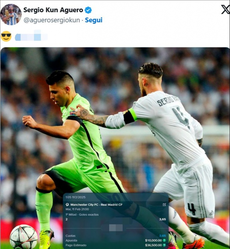 2月13日訊 在曼城2-3輸給皇馬的歐冠附加賽中,曼城名宿阿圭羅對比賽進行了投注,他下注上半場以2粒進球結束,最終曼城1-0領先皇馬結束了上半場,阿圭羅也因此輸?shù)袅?萬歐。