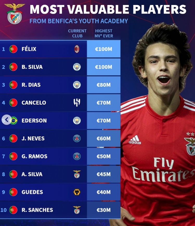2月13日訊 《轉(zhuǎn)會(huì)市場(chǎng)》統(tǒng)計(jì)了本菲卡青訓(xùn)歷史身價(jià)最貴榜,菲利克斯和B席1億歐并列居首。