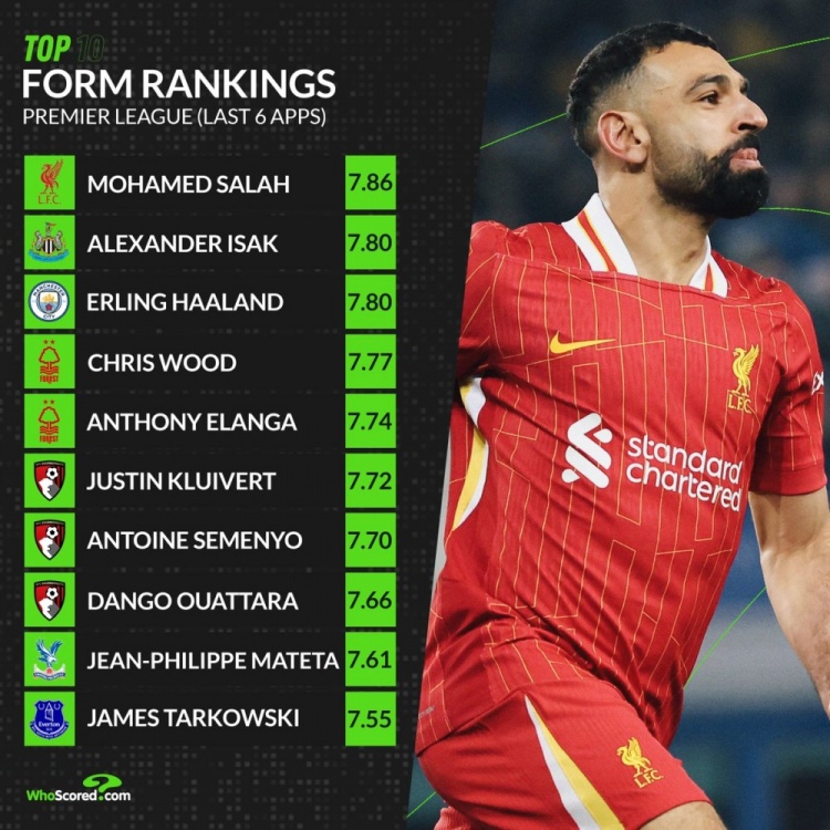 2月15日訊 數(shù)據(jù)結(jié)構(gòu)whoscored統(tǒng)計了近6場英超場均評分情況,薩拉赫重返榜首。