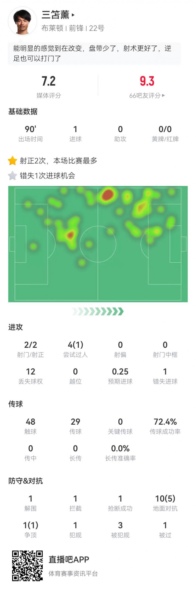 2月15日訊 布萊頓在本輪英超3-0完勝切爾西,三笘薰本場數(shù)據(jù)如下:首發(fā)踢滿全場1球預(yù)期進(jìn)球0.2548觸球29傳球、21成功,成功率72%2射門、2射正4過人、1成功1錯失重大機會11對抗、6成功12丟失球權(quán)1犯規(guī)3造犯規(guī)1解圍1攔截1搶斷1被過獲評7.2分 本文標(biāo)簽: 足球 英超 切爾西 布萊頓