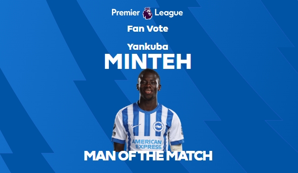 此役出任邊衛(wèi)的明特為布萊頓打進2球,英超官方宣布,他當選本場比賽最佳球員。