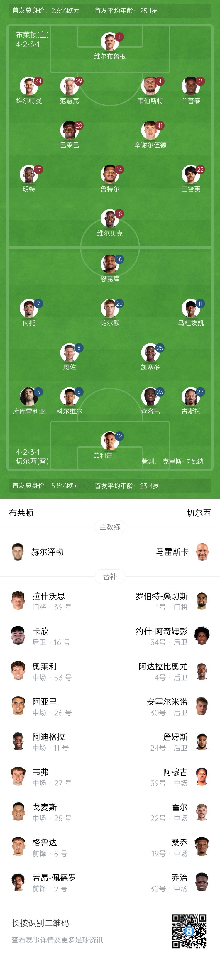 布萊頓首發(fā):1-維爾布魯根、34-維爾特曼、29-范赫克、4-韋伯斯特、2-蘭普泰、20-巴萊巴、41-辛謝爾伍德、17-明特、14-魯特爾、22-三笘薰、18-維爾貝克