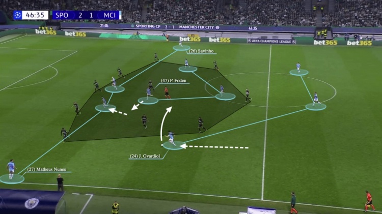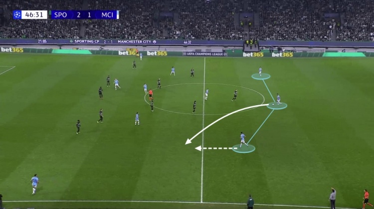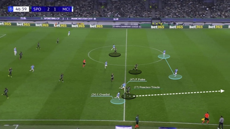 最明顯的例子是對(duì)陣葡萄牙體育的比賽。曼城在下半場(chǎng)一開(kāi)始就失誤了,一個(gè)簡(jiǎn)單的二過(guò)一足以讓貢薩爾維斯從他們的中場(chǎng)身后進(jìn)入。他傳球給邊后衛(wèi)馬克西米利亞諾-阿勞霍,然后皮球越過(guò)了埃德森把守的大門(mén)。阿勞霍破門(mén)后僅86秒,葡萄牙體育就獲得了一個(gè)點(diǎn)球。從開(kāi)球開(kāi)始,曼城就立即轉(zhuǎn)變?yōu)?-1-3-3陣型來(lái)對(duì)陣葡萄牙體育的五后衛(wèi)。阿坎吉將球傳給了格瓦迪奧爾,后者在理論上來(lái)說(shuō)是有足夠向前推進(jìn)的空間。