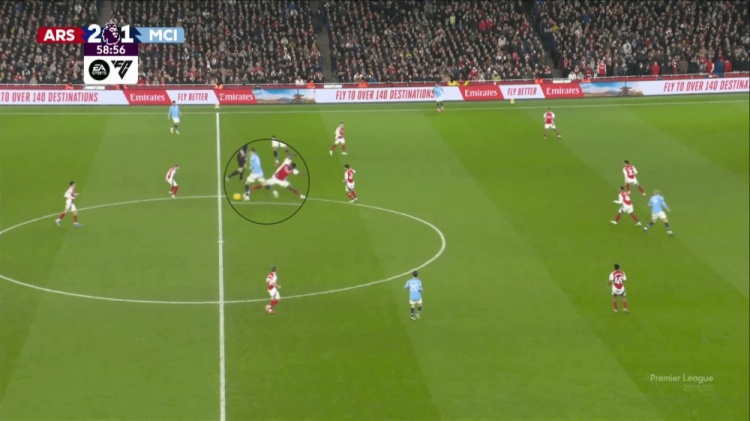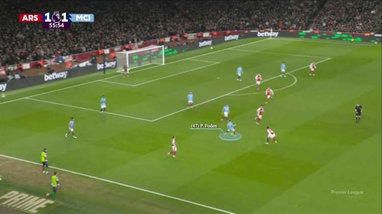福登、薩維尼奧,再加上曼城的三名中場(chǎng)球員,他們?cè)谇蜷T(mén)附近有太多的球員,使得他們很難長(zhǎng)傳球調(diào)度(哈蘭德在中線附近,沒(méi)有出現(xiàn)在這個(gè)鏡頭中)。