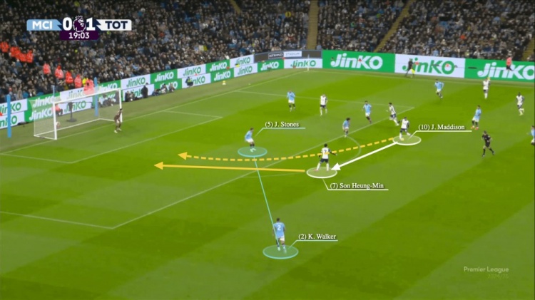麥迪遜側(cè)身傳球找到孫興慜,然后完成突破。孫興慜直面埃德森,完成破門(mén)。