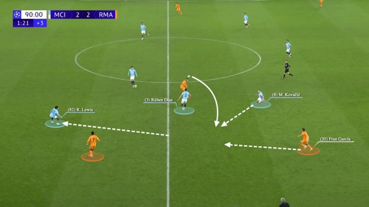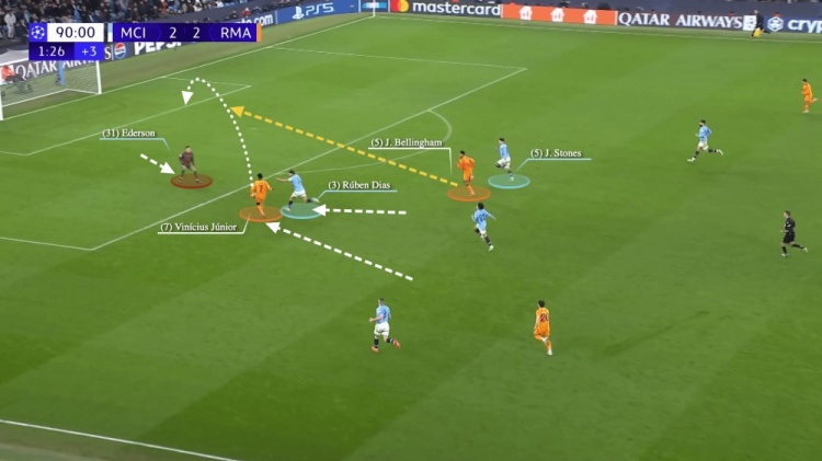 理想情況下,斯通斯和魯本-迪亞斯會(huì)形成默契的配合。雖然魯本-迪亞盯著弗蘭-加西亞,并試圖后撤,但斯通斯出現(xiàn)在一個(gè)更靠后的位置,使得貝林厄姆并沒(méi)有被緊盯,有了一個(gè)向前的機(jī)會(huì)。