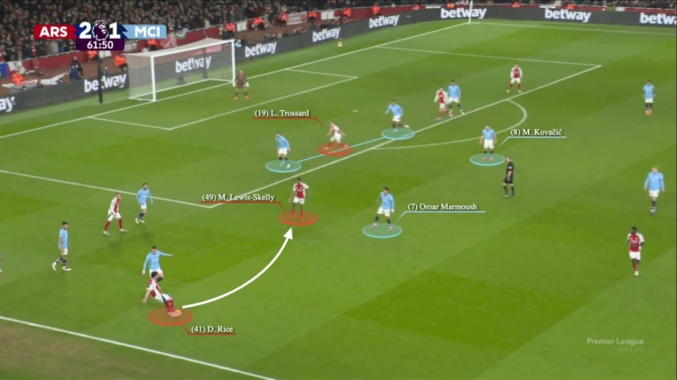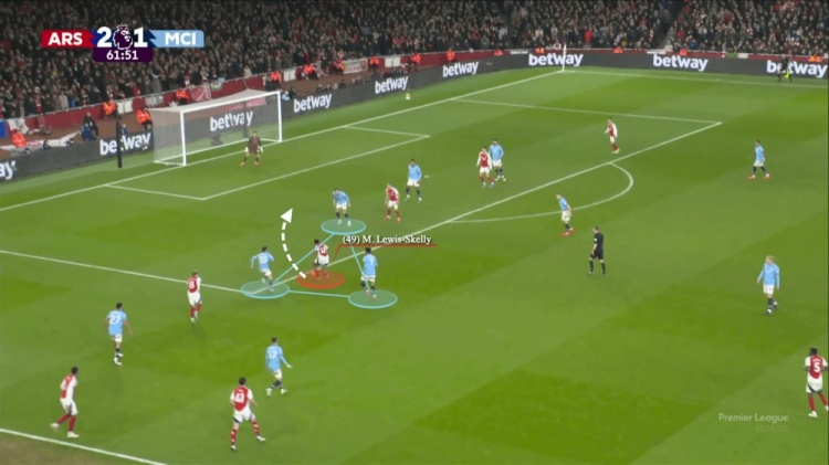 10號(hào)特林康接球,福登和格瓦迪奧爾都在他的身后。曼城有兩名中后衛(wèi),而阿坎吉也在后撤,因?yàn)樗O(shè)法協(xié)助缺乏對(duì)抗經(jīng)驗(yàn)的年輕球員賈馬伊·辛普森-普西,以應(yīng)對(duì)約克雷斯。特林康一路帶球到曼城禁區(qū),并沒(méi)有受到遭到任何防守威脅。