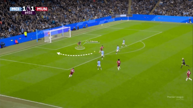 為了應(yīng)對(duì)曼聯(lián)的進(jìn)攻,埃德森保持了一個(gè)較高的站位,但沒(méi)有進(jìn)一步向前采取動(dòng)作。當(dāng)球進(jìn)入曼城禁區(qū)之后,阿瑪?shù)路磻?yīng)迅速,帶球突破埃德森,小角度完成破門(mén)。