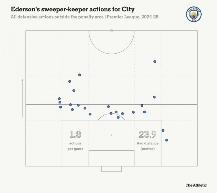 曼城的防守缺陷,使得他們對(duì)埃德森的清道夫門(mén)將屬性要求更高了。他的場(chǎng)均1.8次撲救和23.9次的場(chǎng)均禁區(qū)外動(dòng)作,是他自2021/2022賽季意義來(lái)最高的,當(dāng)時(shí)分別為1.5次和25.3次。