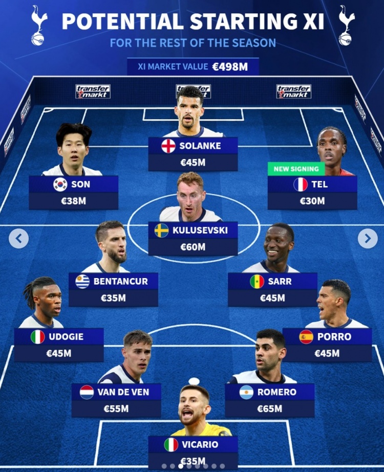 德轉預測熱刺下半程首發(fā)陣:總身價4.98億歐