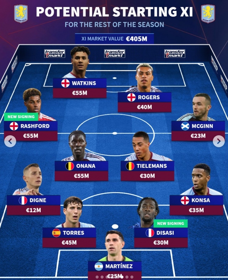 德轉預測維拉下半程首發(fā)陣:總身價4.05億歐