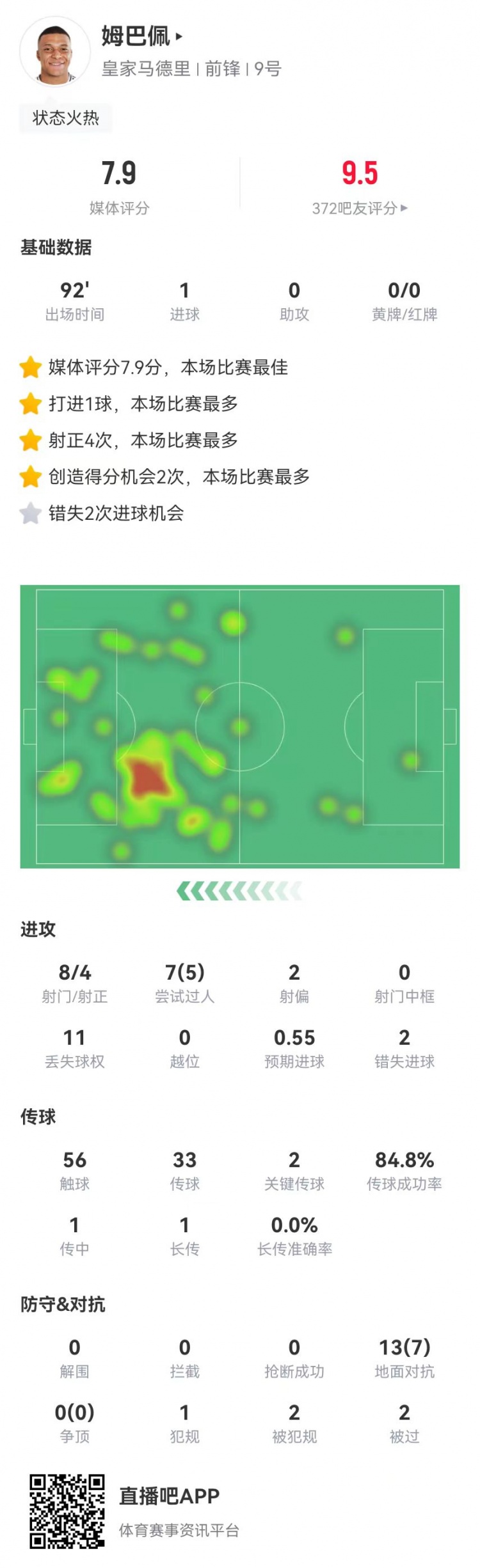 2月16日訊 皇馬在本輪西甲1-1戰(zhàn)平奧薩蘇納,姆巴佩本場(chǎng)數(shù)據(jù)如下:
