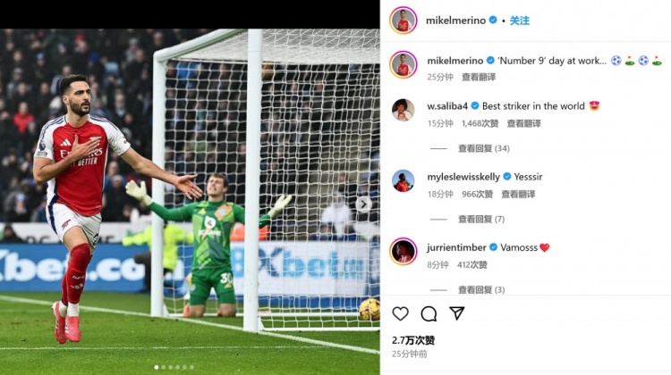 梅里諾首次客串中鋒便打進(jìn)2球,他也通過(guò)社媒曬出自己進(jìn)球后的慶祝照,并配文:“9號(hào)位上班日… ????????”