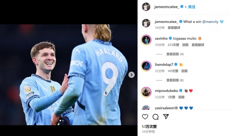 麥卡蒂也在賽后通過社媒曬出自己和哈蘭德慶祝進(jìn)球的合照,并配文:“多棒的一場(chǎng)勝利!@曼城俱樂部”。