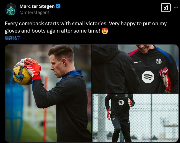 2月16日訊 巴薩門將特爾施特根更新社媒,慶祝自己回到訓練場。特爾施特根寫道:“每次回歸都是從小的勝利開始的,很高興我能在時隔一段時間后再次穿上門將手套和球鞋!”特爾施特根在去年9月重傷,本賽季只為巴薩出場過7次。 本文標簽: 足球 西甲 巴塞羅那