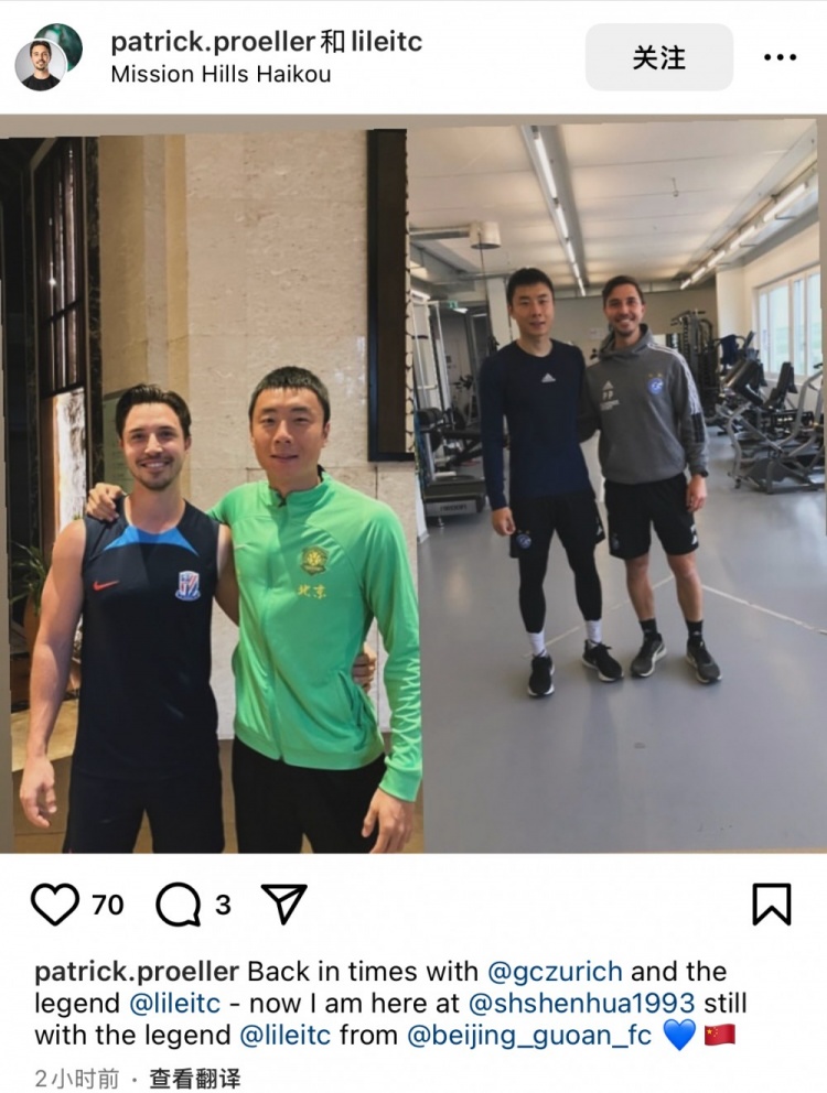 1月26日訊 今日,現(xiàn)任上海申花理療師帕特里克-普羅勒(Patrick Proeller)在社媒曬出和國安后衛(wèi)李磊的兩張合影,其中一張為最近拍攝,另外一張則是在李磊效力草蜢時期拍攝。