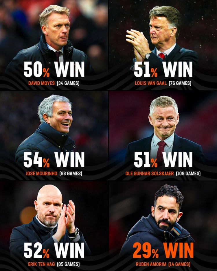 據(jù)統(tǒng)計,自接手曼聯(lián)以來,阿莫林在英超中的勝率只有29%(14場贏下4場),是后弗格森時代曼聯(lián)所有正式教練中最低的。