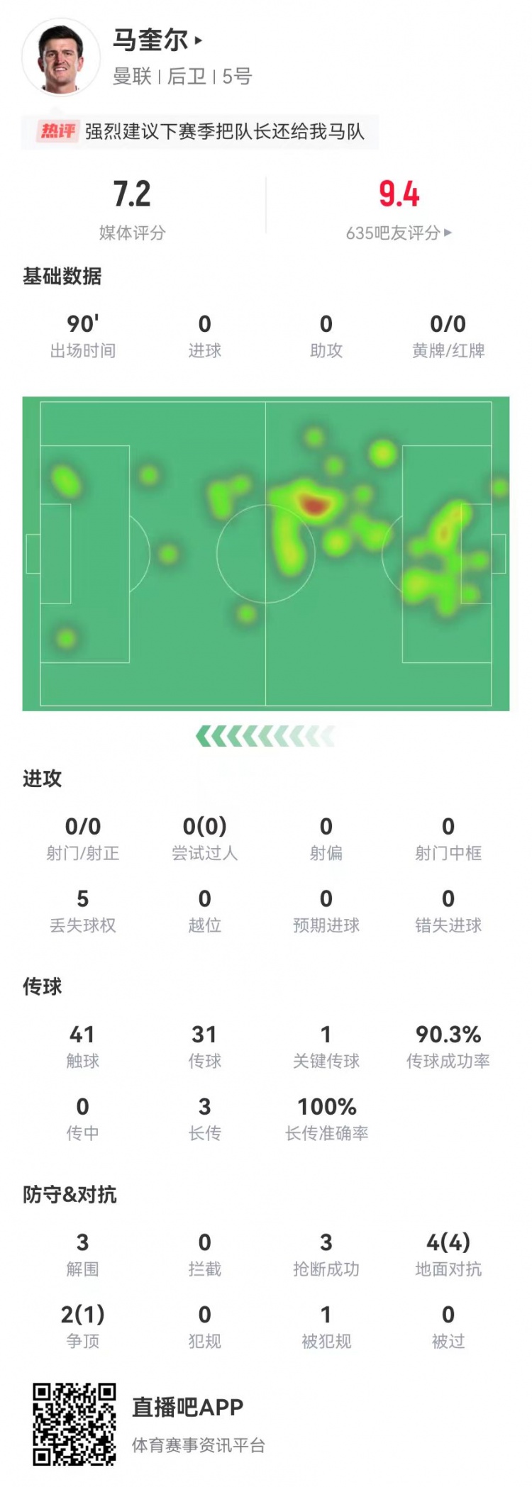 2月17日訊 曼聯(lián)在本輪英超0-1不敵熱刺,馬奎爾本場數(shù)據(jù)如下:首發(fā)踢滿全場3解圍1封堵3搶斷0被過6對抗、5成功5丟失球權(quán)1造犯規(guī)0犯規(guī)41觸球31傳球、28成功,成功率90%1關(guān)鍵傳球3長傳、3成功獲評7.2分 本文標(biāo)簽: 足球 英超 曼聯(lián) 熱刺