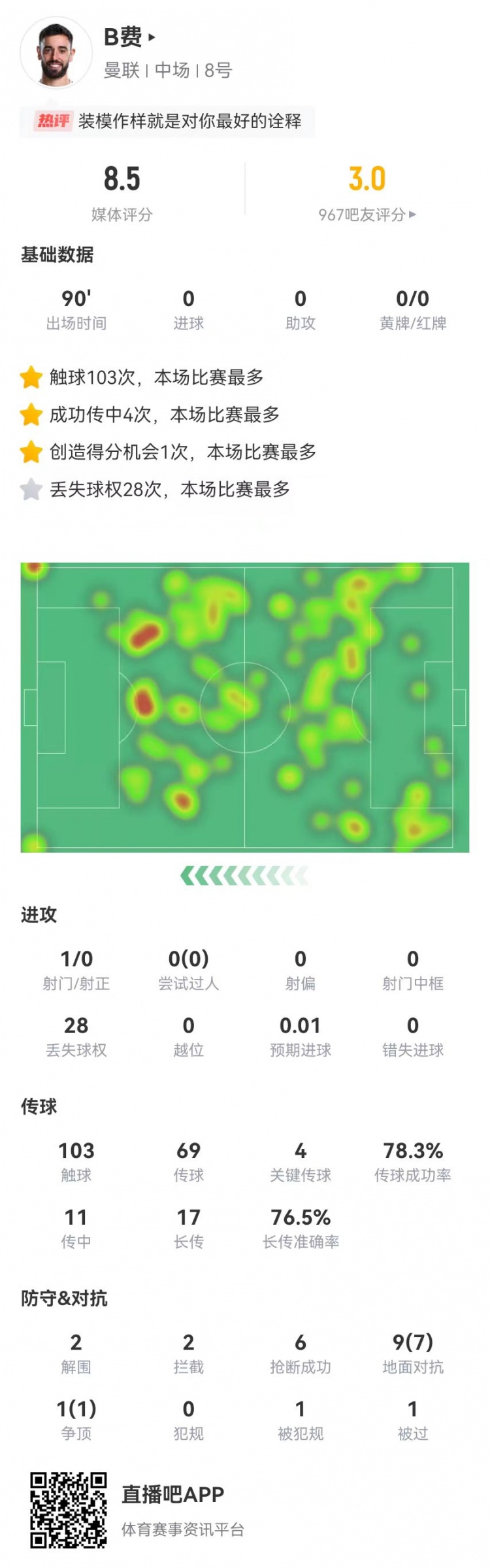 B費本場4關鍵傳球+10對抗8成功 28丟失球權+6搶斷 8.5分全隊最高
