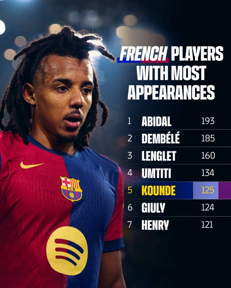 巴薩官方社媒曬出隊(duì)史法國(guó)球員出場(chǎng)次數(shù)榜單,孔德為巴薩出戰(zhàn)125場(chǎng)比賽,超越久利,排名第5位。