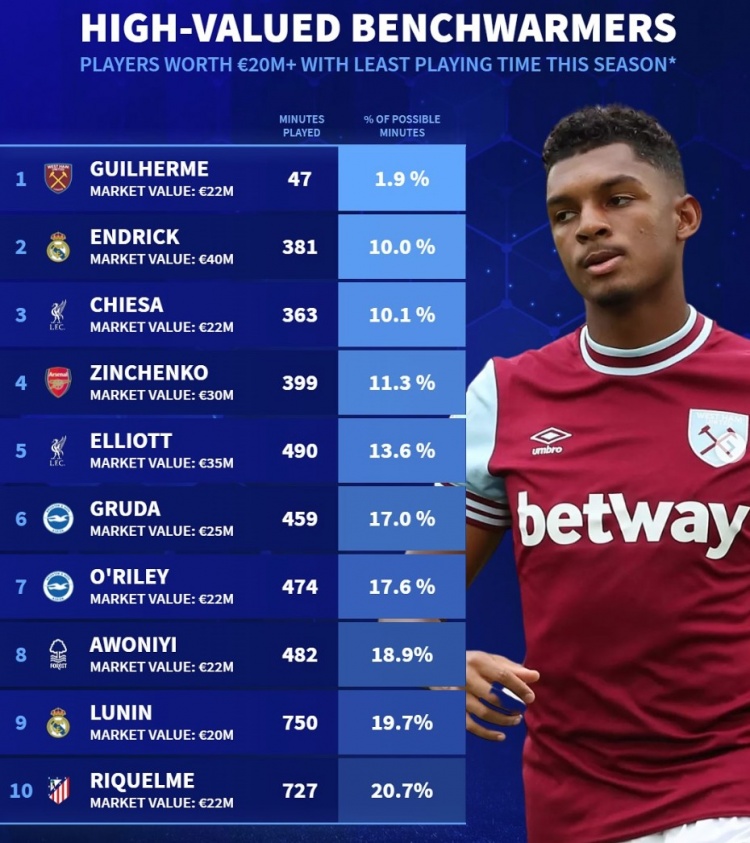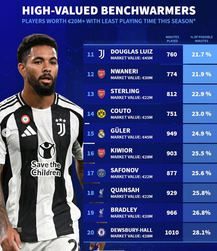 2月18日訊 《轉(zhuǎn)會市場》統(tǒng)計了本賽季身價2000萬歐元以上球員的出場時間情況,并列出了冷板凳榜單。