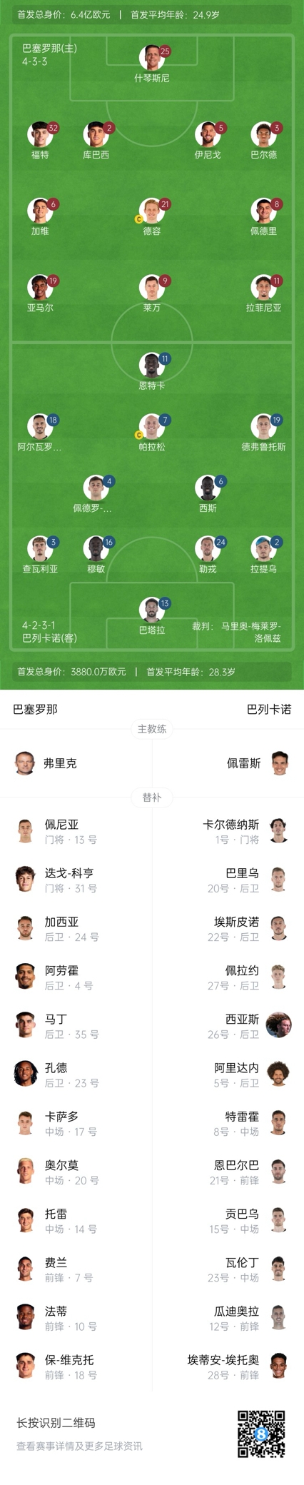 巴薩首發(fā):25-什琴斯尼、2-庫巴西、5-伊尼戈-馬丁內(nèi)斯、3-巴爾德、32-??送?福特、6-加維、21-德容、8-佩德里、11-拉菲尼亞、19-亞馬爾、9-萊萬多夫斯基