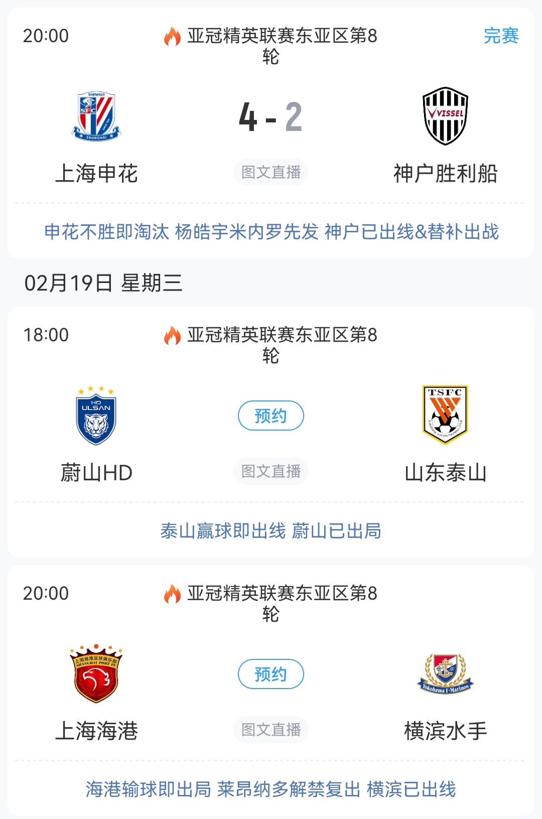泰山和海港都將在明天出戰(zhàn),泰山只要不輸球就能拿到晉級名額,而海港需要3分才能升入晉級區(qū)。只要泰山輸球或海港不勝,申花就能晉級到淘汰賽階段。