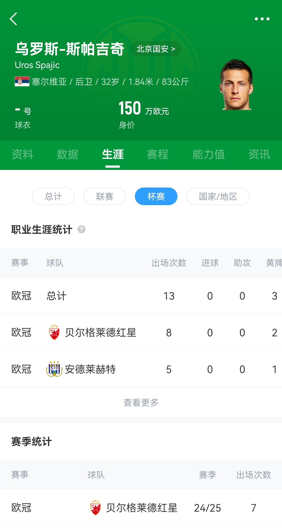 斯帕吉奇出生于1993年2月13日,身高188cm,體重83kg,塞爾維亞籍,司職后衛(wèi)。身為塞爾維亞國腳的斯帕吉奇代表塞爾維亞國家隊出戰(zhàn)了世界杯預(yù)選賽、歐洲杯預(yù)選賽和歐國聯(lián)等多項重要賽事。
