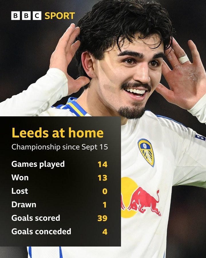 BBC統(tǒng)計(jì)表明,近14個(gè)英冠主場,利茲聯(lián)13勝1平保持不敗,期間狂轟39球只丟4球,沖超的勢頭似乎已經(jīng)無人能擋。