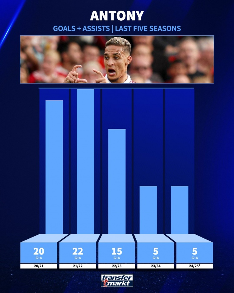 2月18日訊 安東尼冬窗從曼聯(lián)租借加盟貝蒂斯,至今為貝蒂斯出戰(zhàn)4場(chǎng)比賽,打進(jìn)3球助攻1次。德國(guó)轉(zhuǎn)會(huì)市場(chǎng)統(tǒng)計(jì)了安東尼近5個(gè)賽季參與進(jìn)球的數(shù)量,他在21-22賽季參與22球,本賽季至今參與5球。