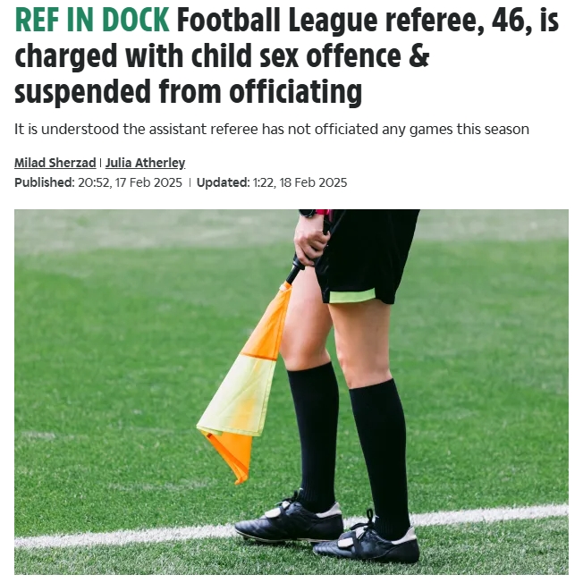 2月18日訊 《太陽(yáng)報(bào)》報(bào)道,一位曾擔(dān)任英格蘭足球聯(lián)賽(EFL,負(fù)責(zé)英冠、英甲、英乙)和足總杯比賽助理裁判的男子將因涉嫌兒童性犯罪出庭受審。