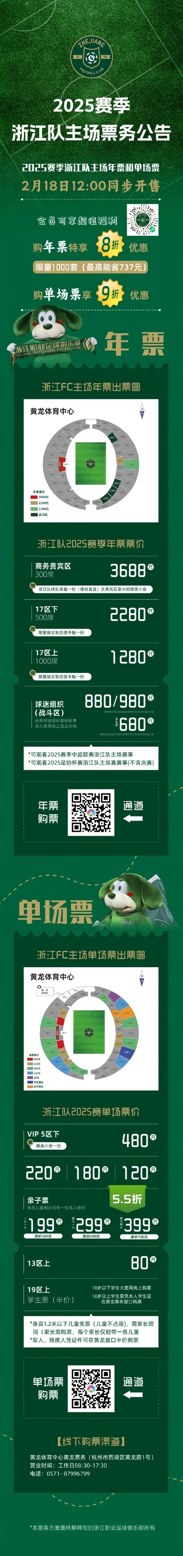 2月18日訊 浙江隊官方公布了2025賽季主場年票和單場球票的票務(wù)方案,2月18日12:00將同步開售。
