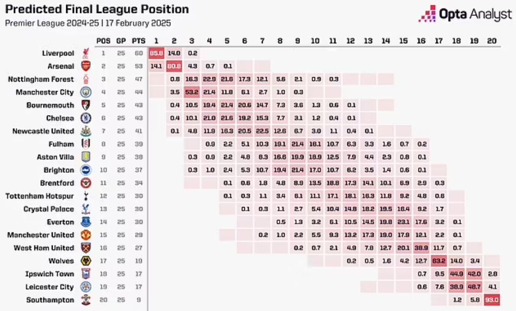 與此同時,曼聯(lián)獲得第17概率為2.2%。第18名的概率也有0.1%,并未完全排除降級可能。