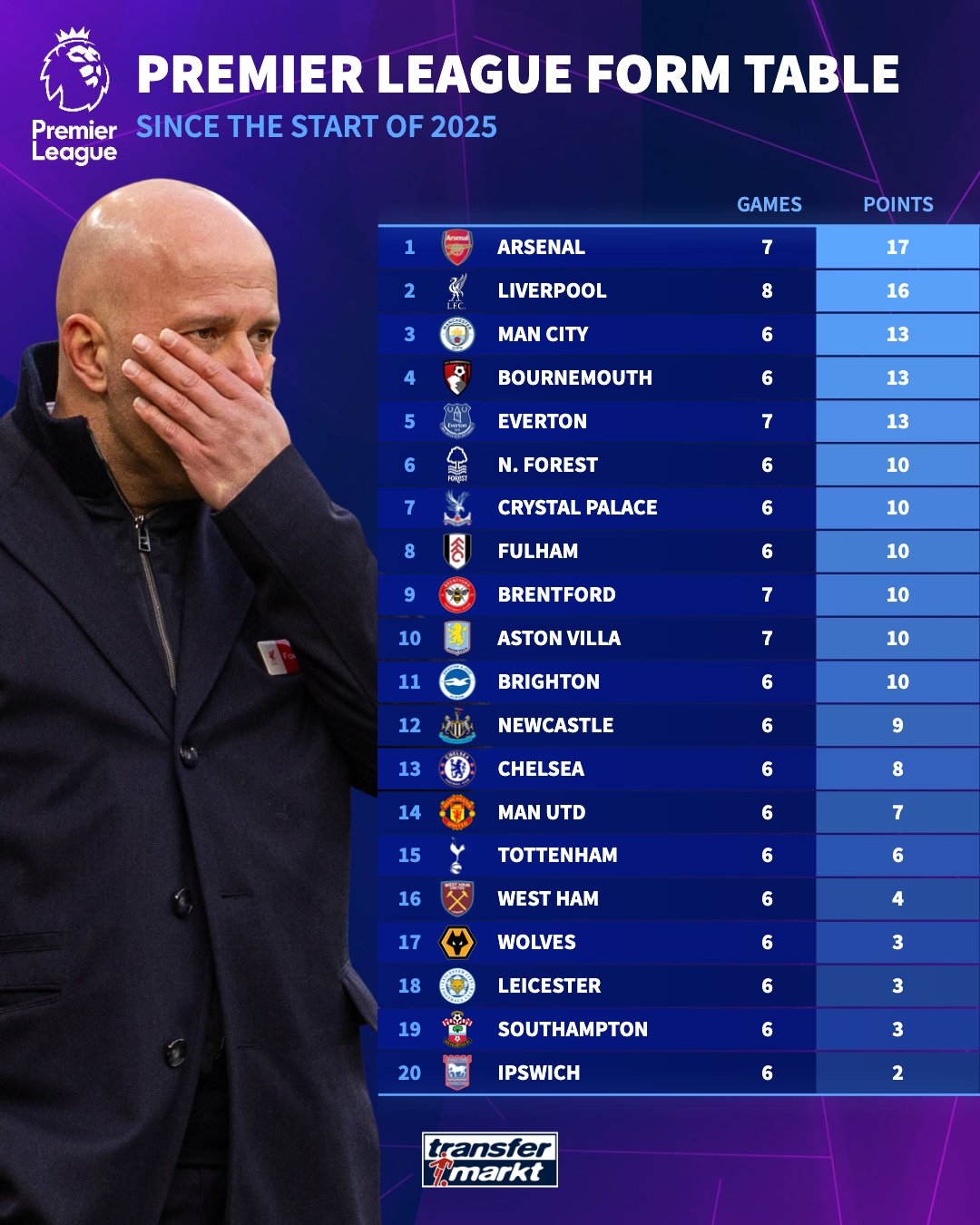 2月20日訊 德國轉(zhuǎn)會(huì)市場(chǎng)統(tǒng)計(jì)了2025年開始至今英超球隊(duì)拿到的積分,并列出榜單,阿森納17分居首,利物浦16分次席。