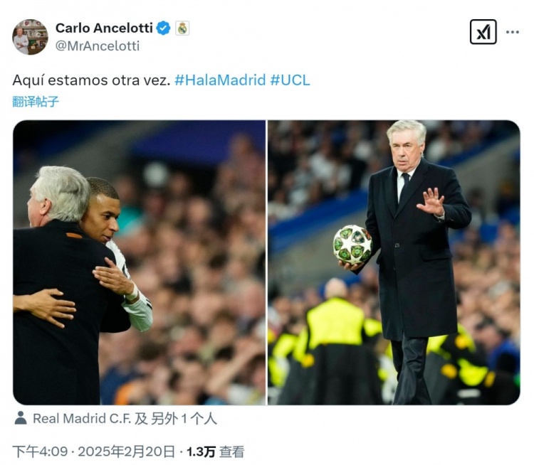 2月20日訊 歐冠淘汰賽附加賽次回合比賽,姆巴佩上演帽子戲法,幫助皇馬主場3-1擊敗曼城,兩回合總比分6-3晉級16強。皇馬主帥安切洛蒂更新社媒動態(tài),曬出與姆巴佩擁抱的照片,配文:“我們又來了,Hala Madrid!”歐冠16強抽簽將在北京時間明天19點進行,皇馬的對手將是馬競或勒沃庫森。 本文標簽: 足球 西甲 皇家馬德里 歐冠 安切洛蒂