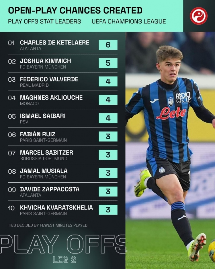 2月21日訊 根據(jù)Squawka統(tǒng)計(jì),在歐冠淘汰賽附加賽次回合比賽中,亞特蘭大中場德凱特拉雷是運(yùn)動(dòng)戰(zhàn)創(chuàng)造機(jī)會(huì)最多的,一共達(dá)到了6次。