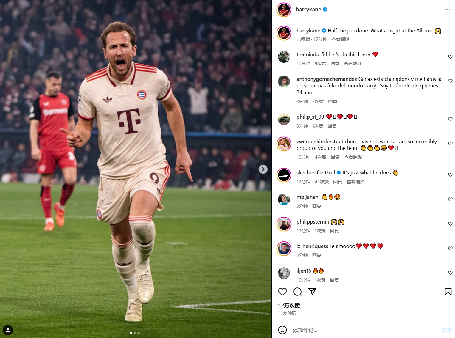 3月6日訊 在本輪歐冠,拜仁3-0大勝勒沃庫(kù)森。本場(chǎng)比賽凱恩梅開二度,賽后他也在個(gè)人社媒曬出本場(chǎng)慶祝照片,配文寫道:“完成一半的工作,安聯(lián)球場(chǎng)的美妙之夜!” 本文標(biāo)簽: 足球 德甲 拜仁慕尼黑